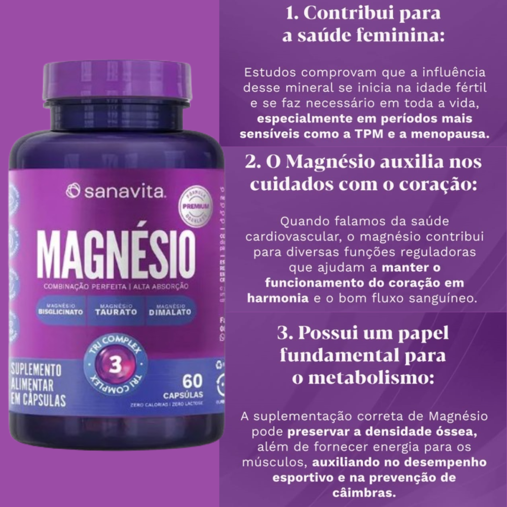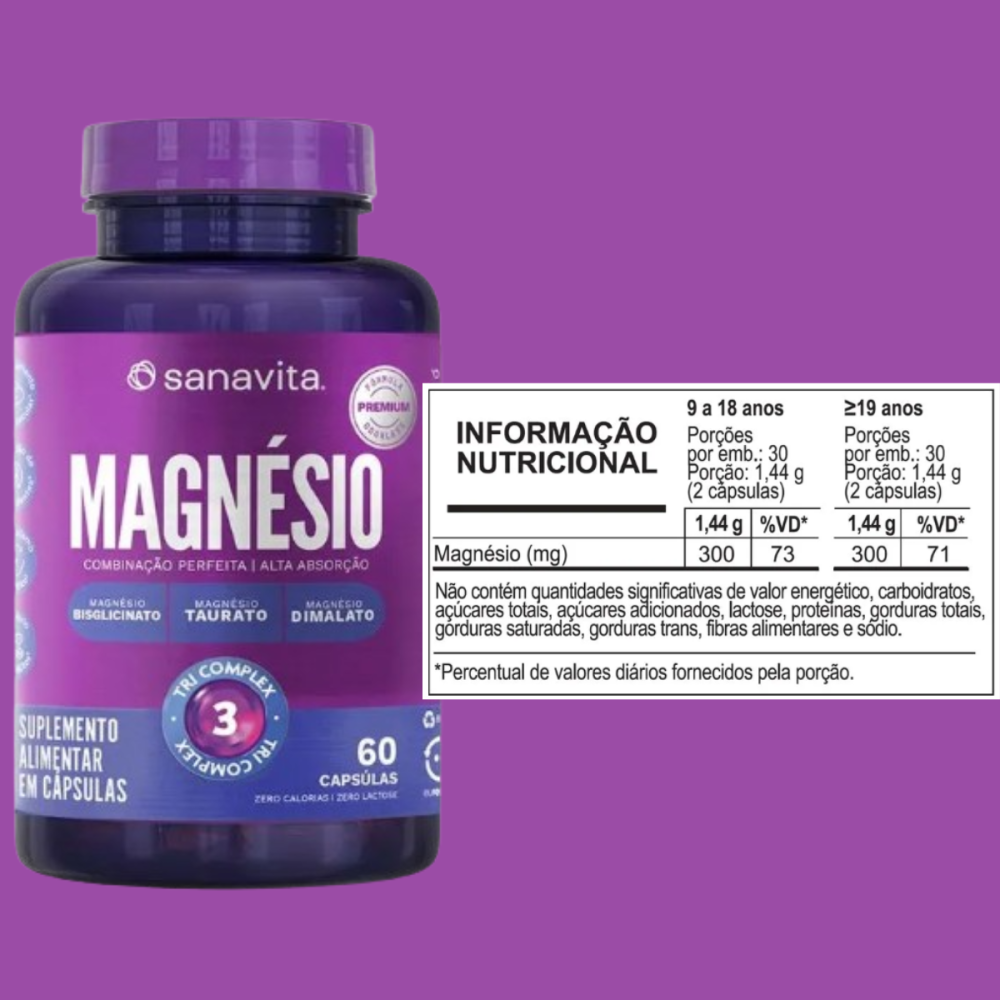 O Magnésio Tri Complex da Sanavita é um suplemento em cápsulas que combina três tipos de magnésio - o bisglicinato, taurato e o dimalato, que atuam de forma sinérgica, potencializando os benefícios. Sua fórmula avançada, de alta absorção, foi desenvolvida por especialistas com base em pesquisa realizada com profissionais da saúde, onde os tipos de magnésio, dosagem diária e até mesmo a forma de apresentação foram avaliados.
