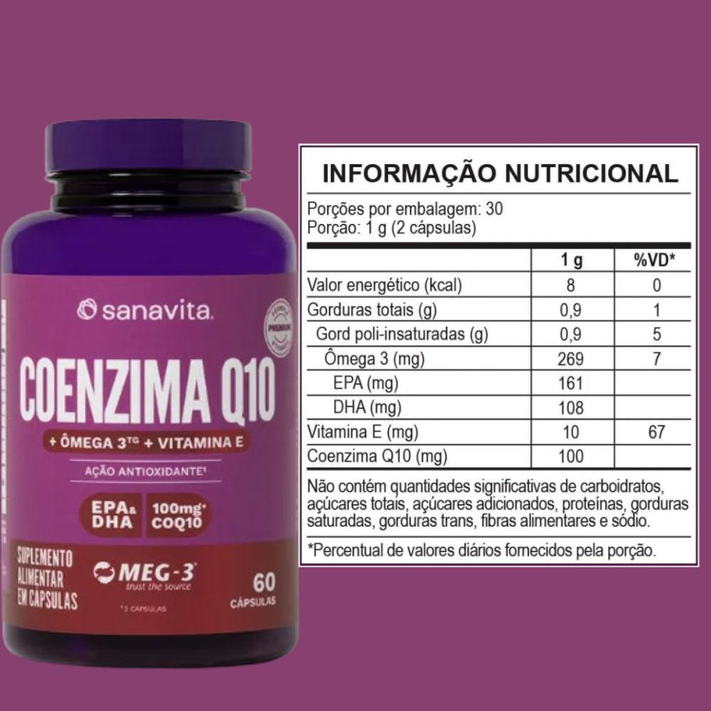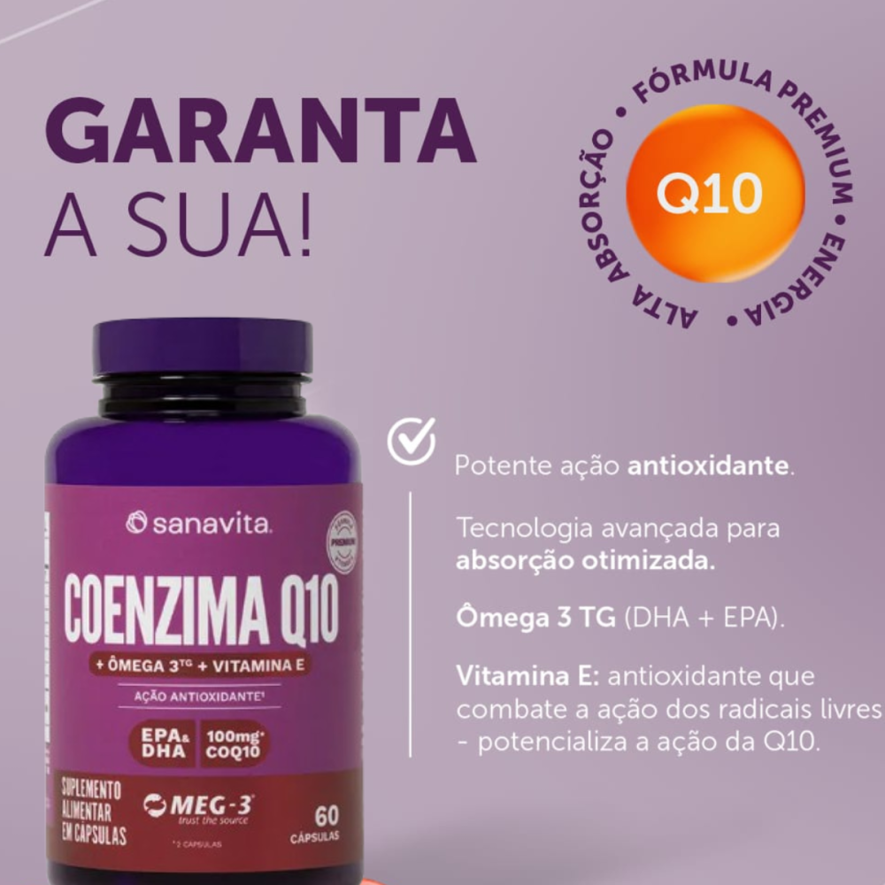 A COENZIMA Q10 da Sanavita® é uma fórmula diferenciada e eficiente, que associa a dose ideal de Q10 recomendada pelos estudos, a nutrientes que tornam a sua absorção muito mais otimizada, entre eles o ômega-3 na forma TG, obtido de uma fonte super confiável, que ostenta o selo MEG-3®, marca de alta tecnologia, qualidade e nível de pureza, além de vitamina E, antioxidante que potencializa os benefícios da Q10, protegendo contra os danos causados pelos radicais livres. A coenzima Q10 é um elemento superimportante para o funcionamento do nosso corpo, está intimamente ligada ao metabolismo energético intracelular, especialmente no coração, músculos, fígado e cérebro. É também considerada um potente antioxidante e neutralizador de radicais livres. Sua deficiência pode ser causada pela idade, atividade física excessiva, sono de má qualidade, entre outros fatores.*MEG-3® é uma marca da DSM.