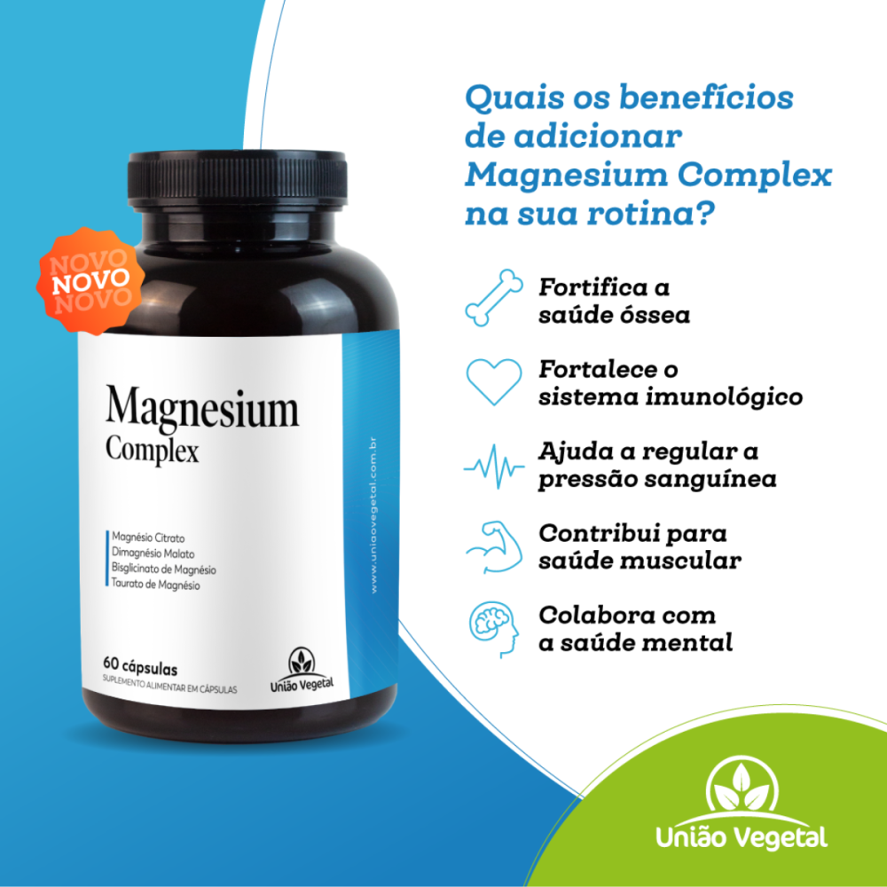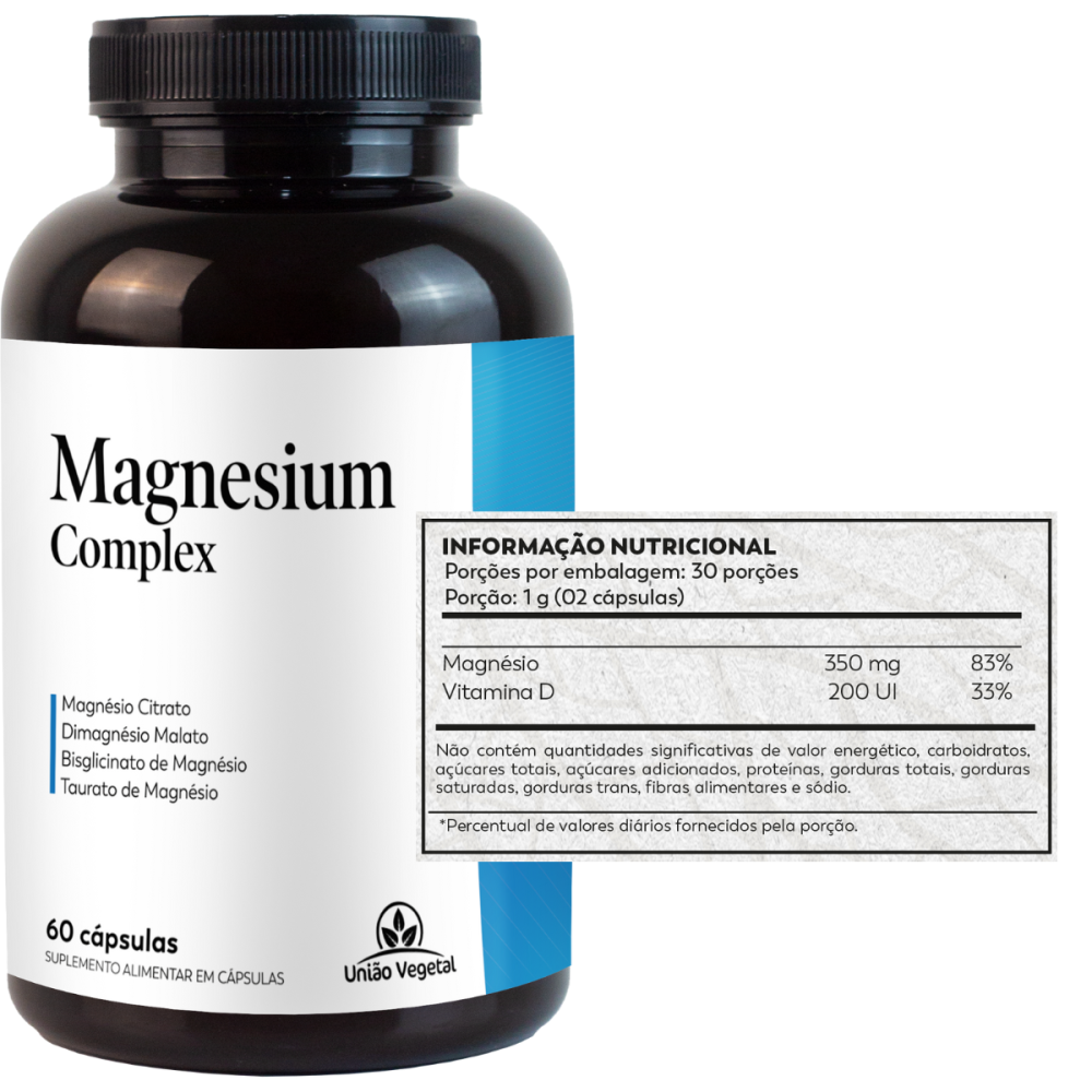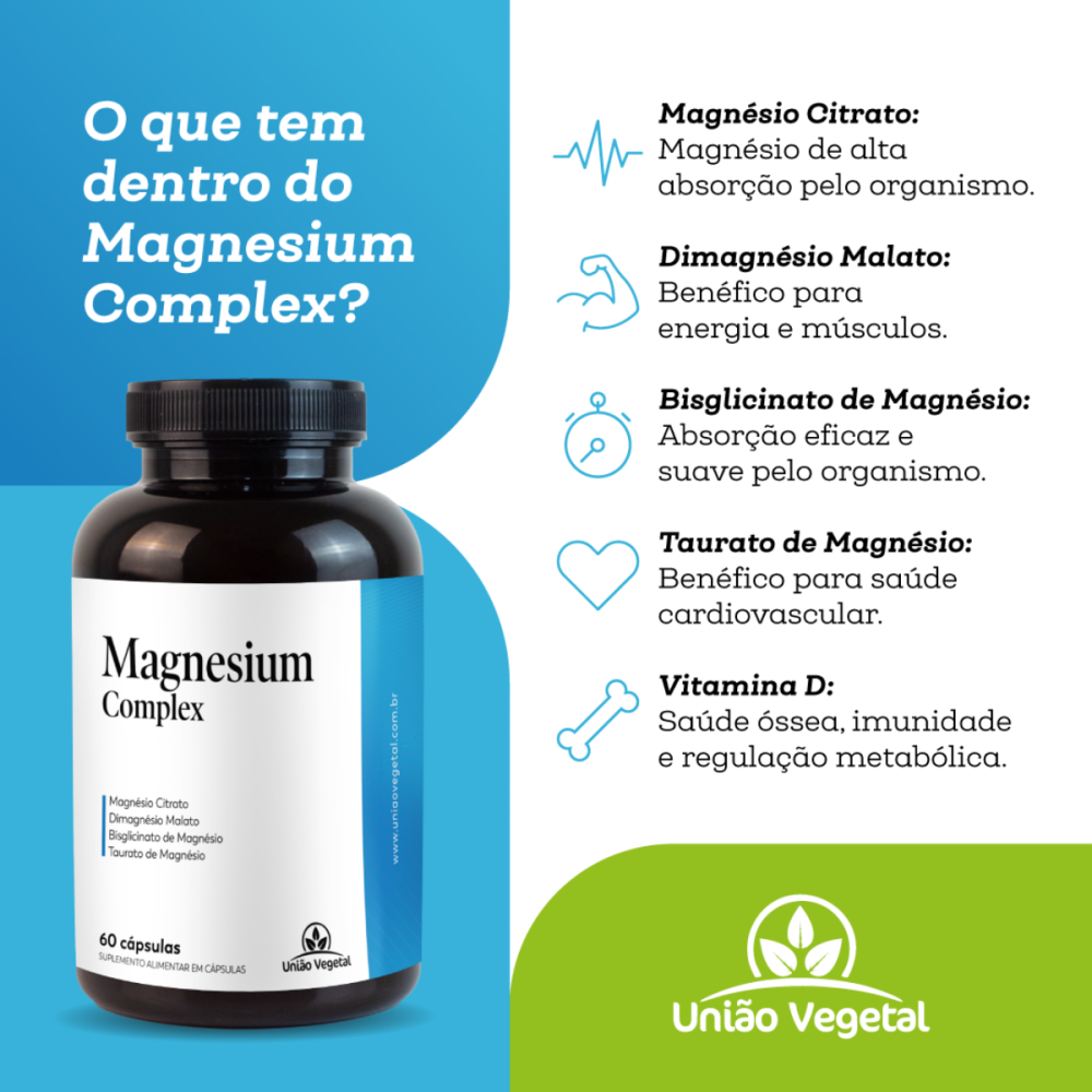 O Magnésio Complex é um suplemento alimentar em cápsulas que combina diferentes formas de magnésio, incluindo citrato de magnésio, malato de magnésio, bisglicinato de magnésio e taurato de magnésio + Vitamina D3. Essa fórmula completa visa aumentar a biodisponibilidade e absorção do magnésio pelo organismo. Com 60 cápsulas por frasco, este suplemento pode ajudar a suprir as necessidades diárias de magnésio, um mineral essencial para diversas funções no corpo, como a contração muscular, o metabolismo energético e a saúde óssea. NÃO CONTÉM GLÚTEN.